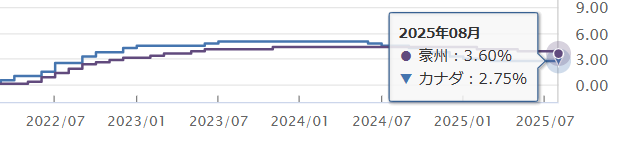 (2025/9/5発表)雇用悪化(8月▲6.6万人)や直近四半期の成長マイナスなど景気後退色の強まりがあり、2025/9/17のBOC政策金利では「25bp利下げ見通しが優勢」の状態です。