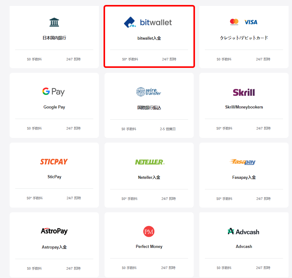 *現在(2024年1月)は新サーバー移行に伴い、【暗号通貨入金・日本銀行入金・クレジットーカード入金】のみの取扱いとなっています。